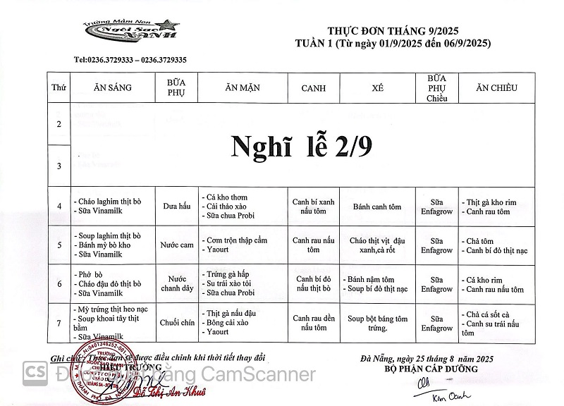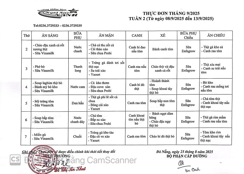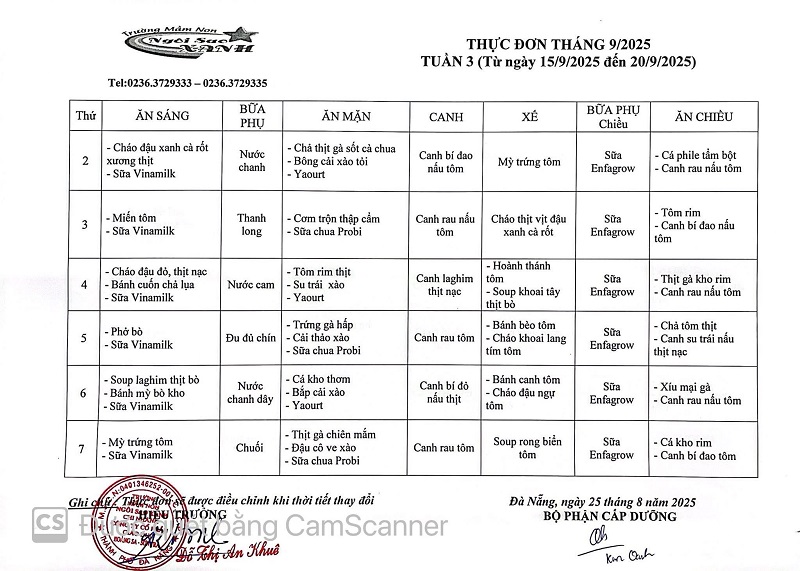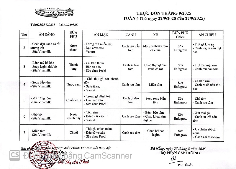 THỰC ĐƠN THÁNG 09 NĂM 2025 CỦA CÁC BÉ
